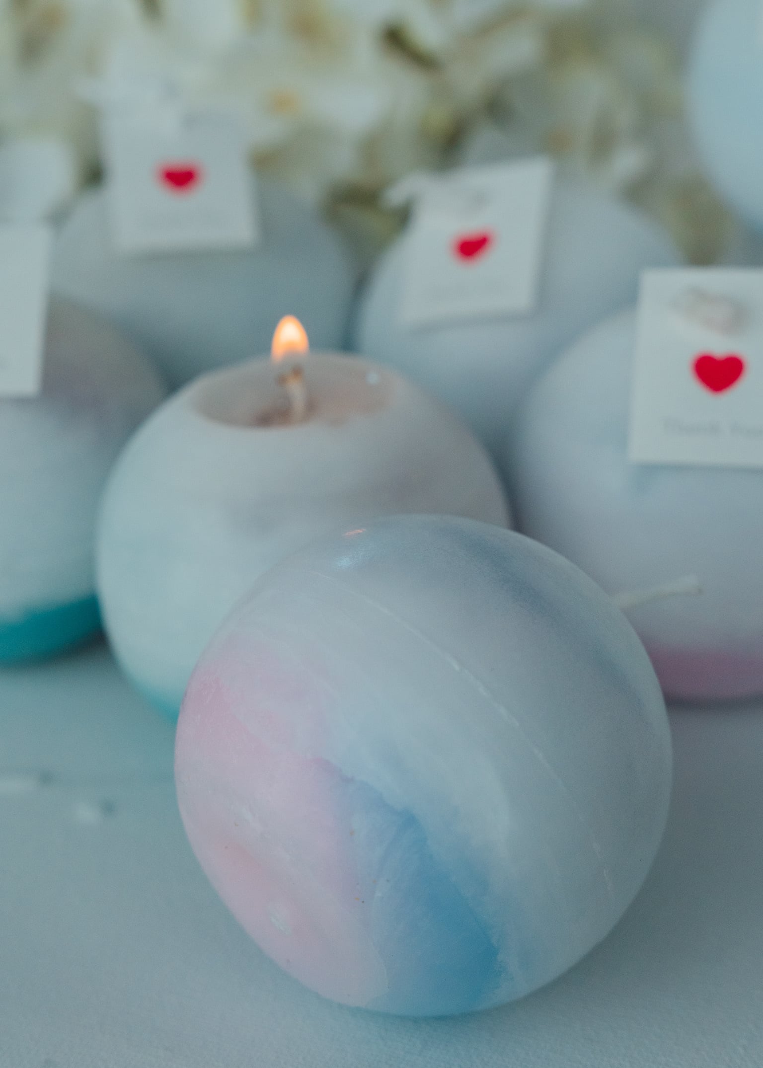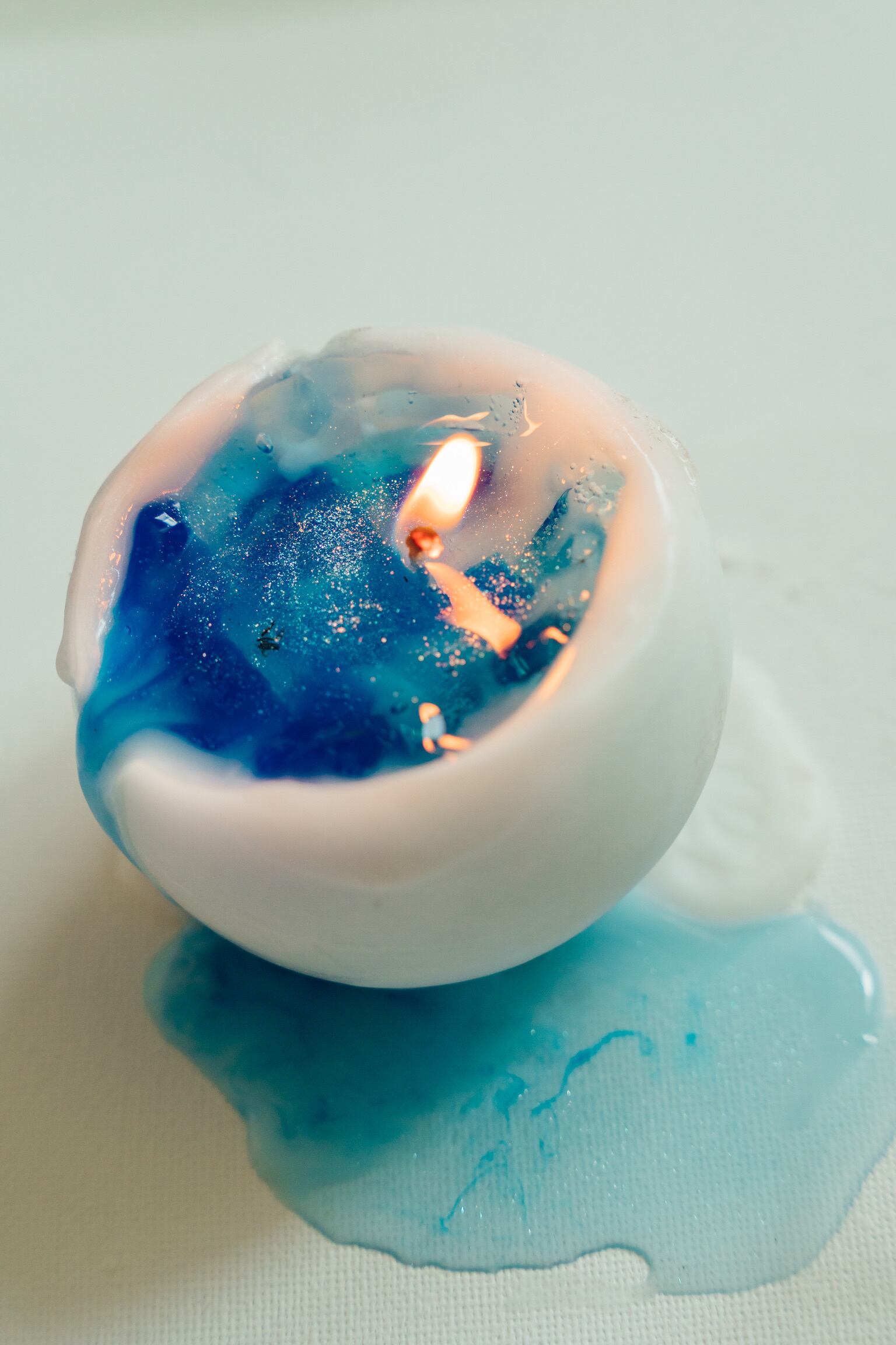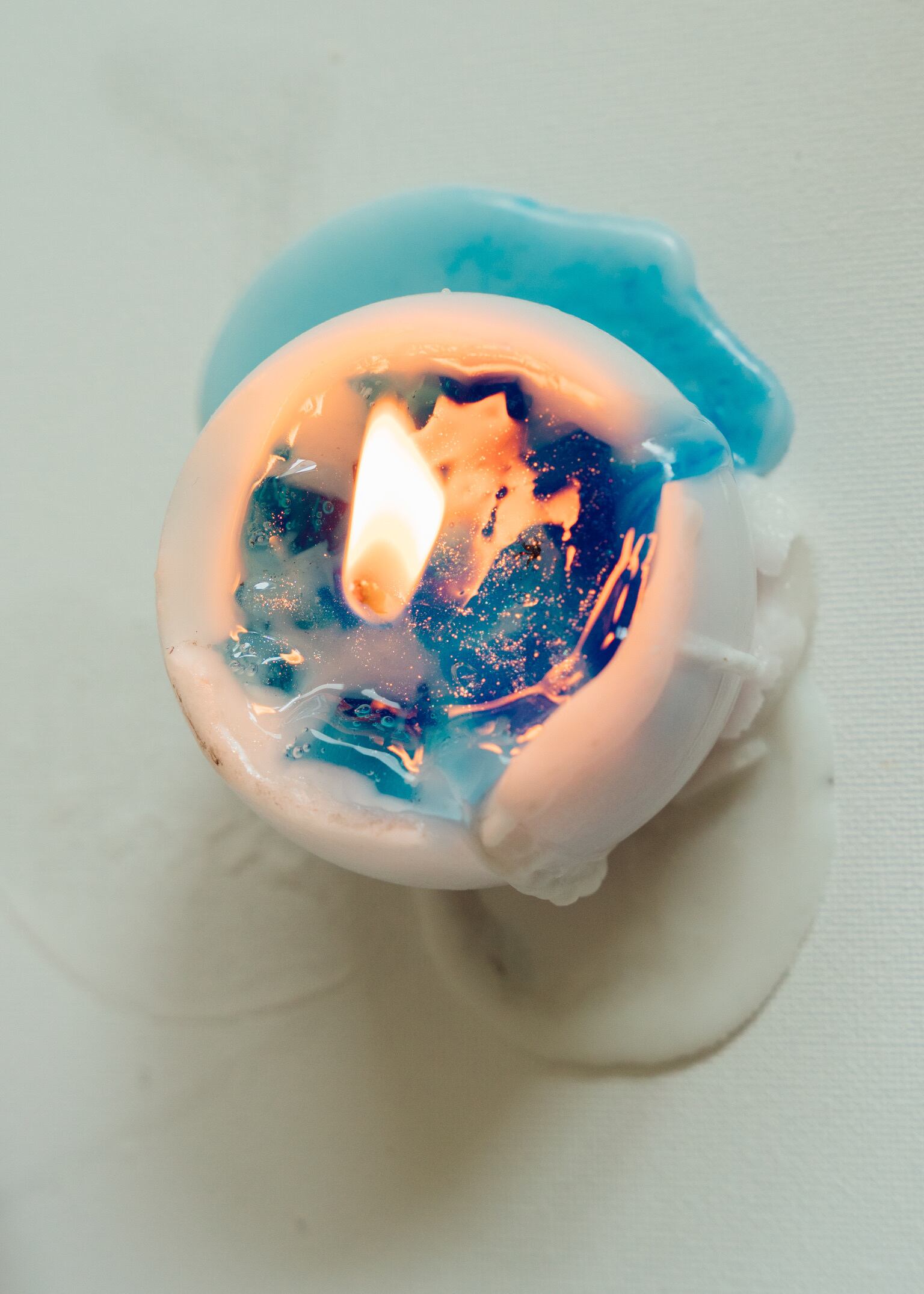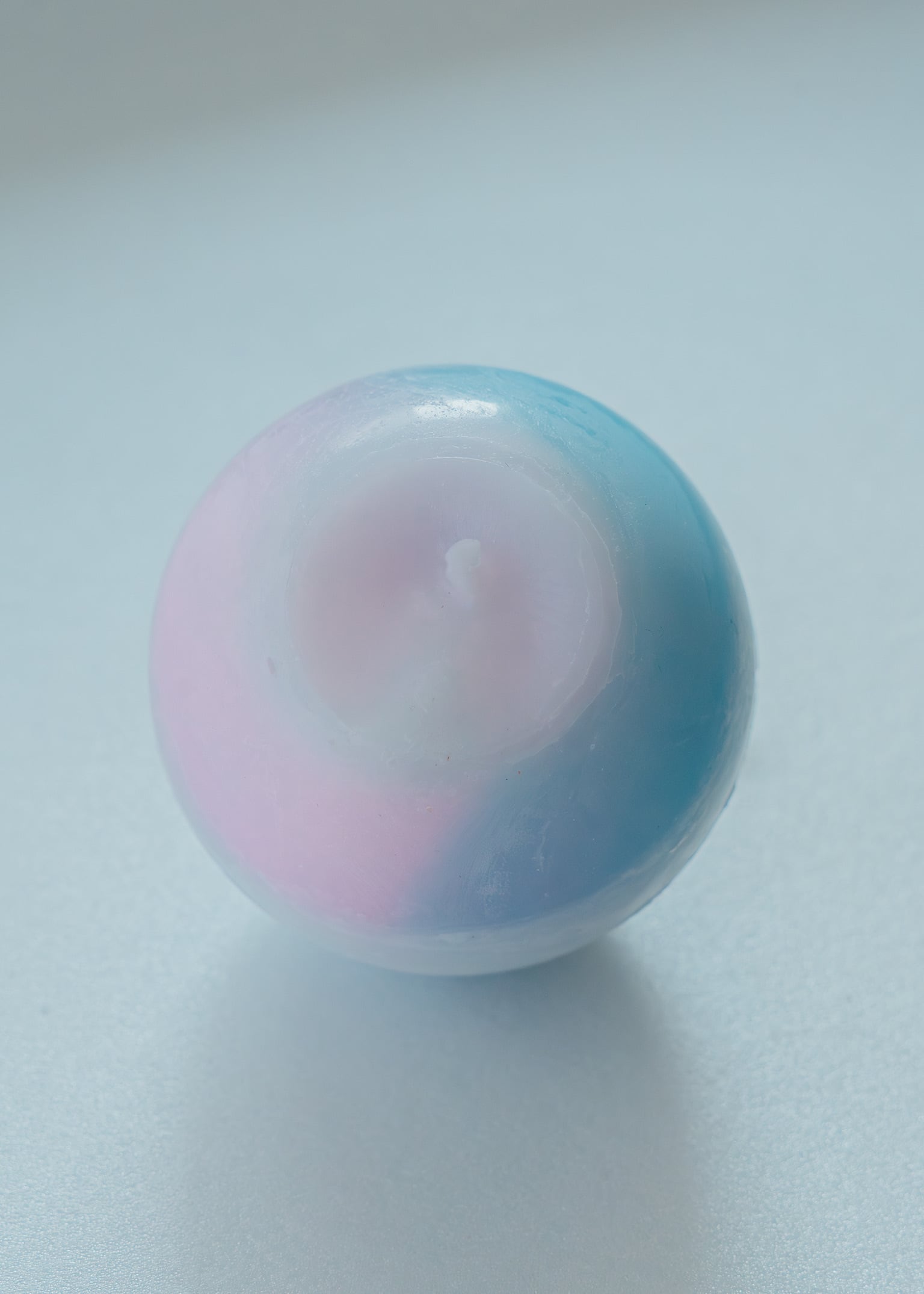 まんまるのフォルムに、沖縄の昼の海を思わせる水色の濃淡を閉じ込めたキャンドル「めざめ」。