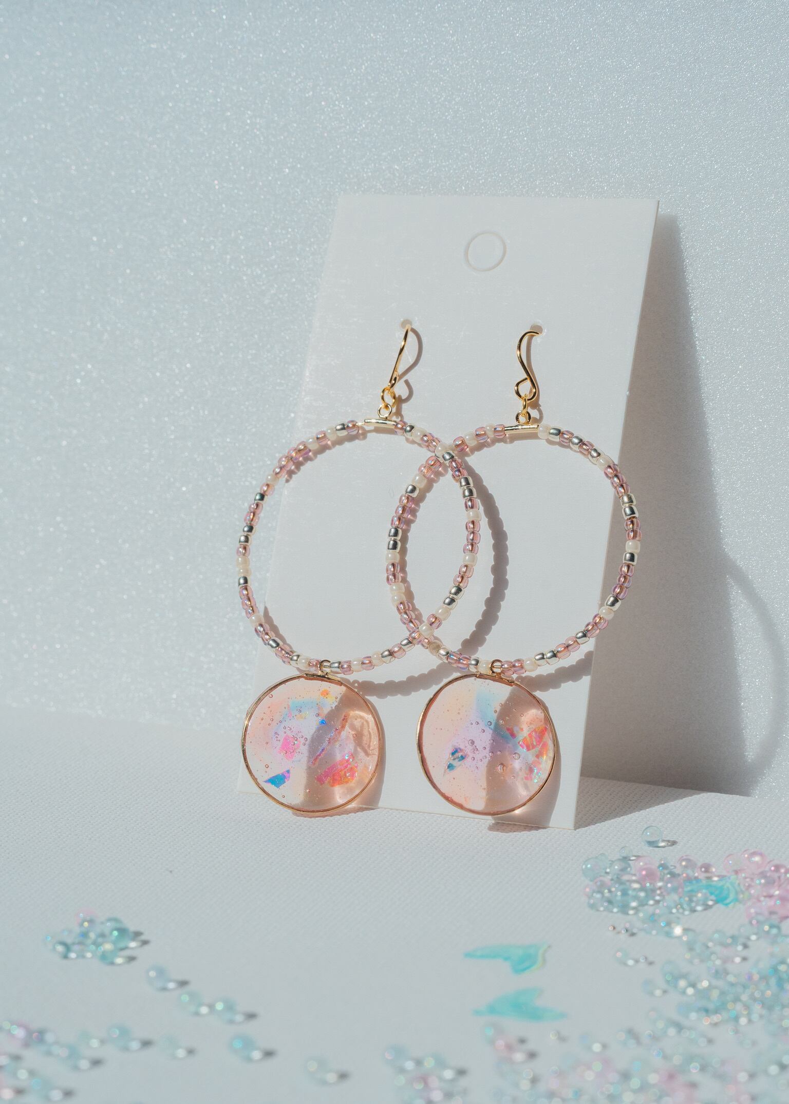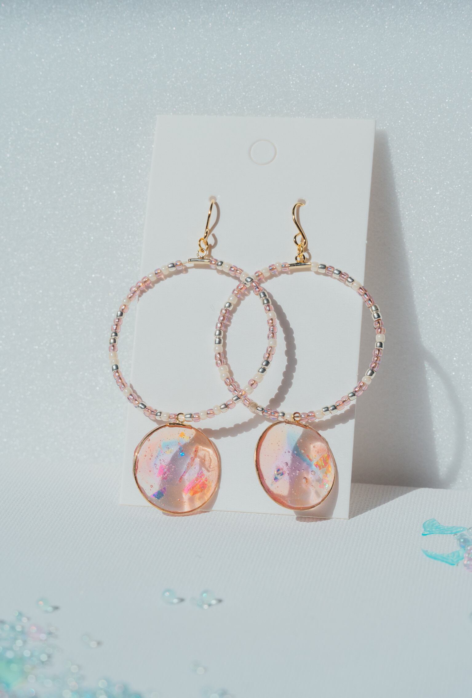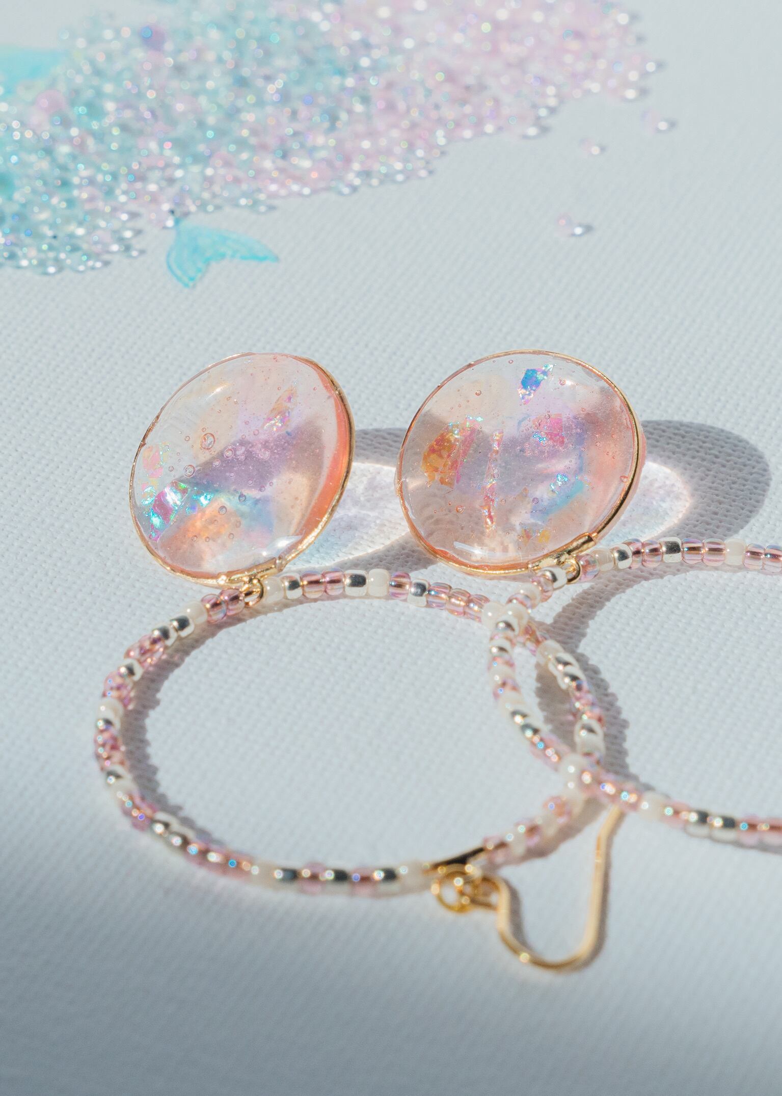 淡いピンクとオーロラの輝きを閉じ込めたレジンパーツを、シードビーズで彩ったフープに合わせました。